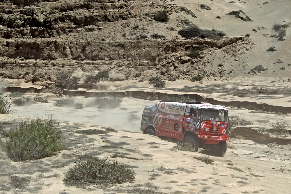 Souboj na špici závodu byl velký, rozdíly na WP pouze sekundy mezi posádkami, které úřadují v čele závodu. Mezi nimi jednoznačně hlavně v první polovině etapy, opět útočila na vítězství i Princezna 69 a posádka 503. Ani jsme si nevšimli z výsledků, že nastaly problémy s řazením. Od Aleše Lopraise jsme zjistili překvapivou zprávu o drama v posledním úseku etapy: „Copiapó, tradičně náročná dunová etapa se vším všudy. Začátek nám šel velmi pěkně, stále jsme bojovali o pódiové umístění v etapě. V poslední třetině etapy, paradoxně v tom nejnevhodnějším místě, mě začalo zlobit řazení. Šly zařadit jen dva z pěti rychlostních stupňů a to jen v „nízké řadě“, tudíž systém zvaný želva... Bylo to utrpení, protože místy nebyla rychlost optimální. V některých dunových trychtýřích nebyla rychlost dostatečná a museli jsme s Princeznou mnohdy skočit některá místa vzduchem, abychom udrželi nájezdovou rychlost do další duny. Měl jsem strach i o spojku, která logicky absorbovala větší zatížení. Navíc nešla ani zpátečka, což právě v dunách může být fatální. Snažil jsem se neudělat chybu. Dostávat Tatru z dunového pole v Copiapu by asistenčním kamionům trvalo dva dny. Dojeli jsme dnes do cíle na želvě se ztrátou zhruba čtyř minut, což je pro nás při problémech s převodovkou malé vítězství. Keep on pushing!“ Takže pokračujeme v tlaku i jízdě.