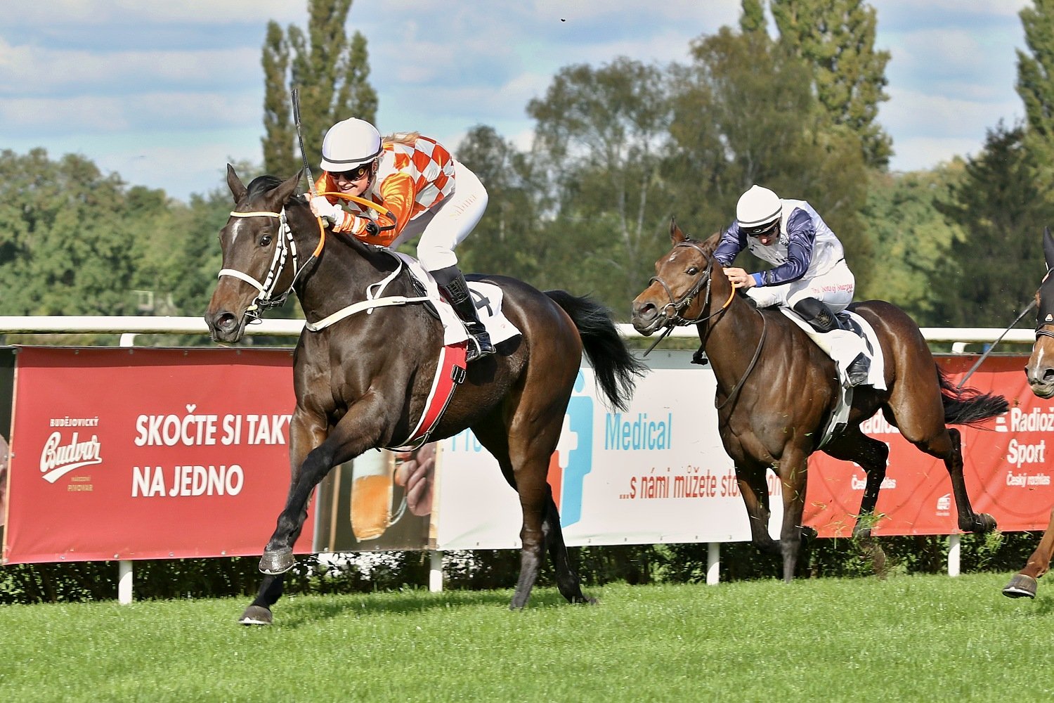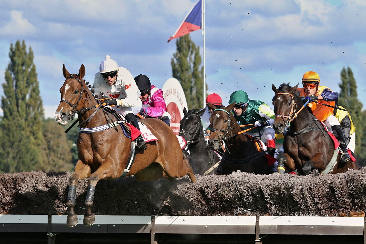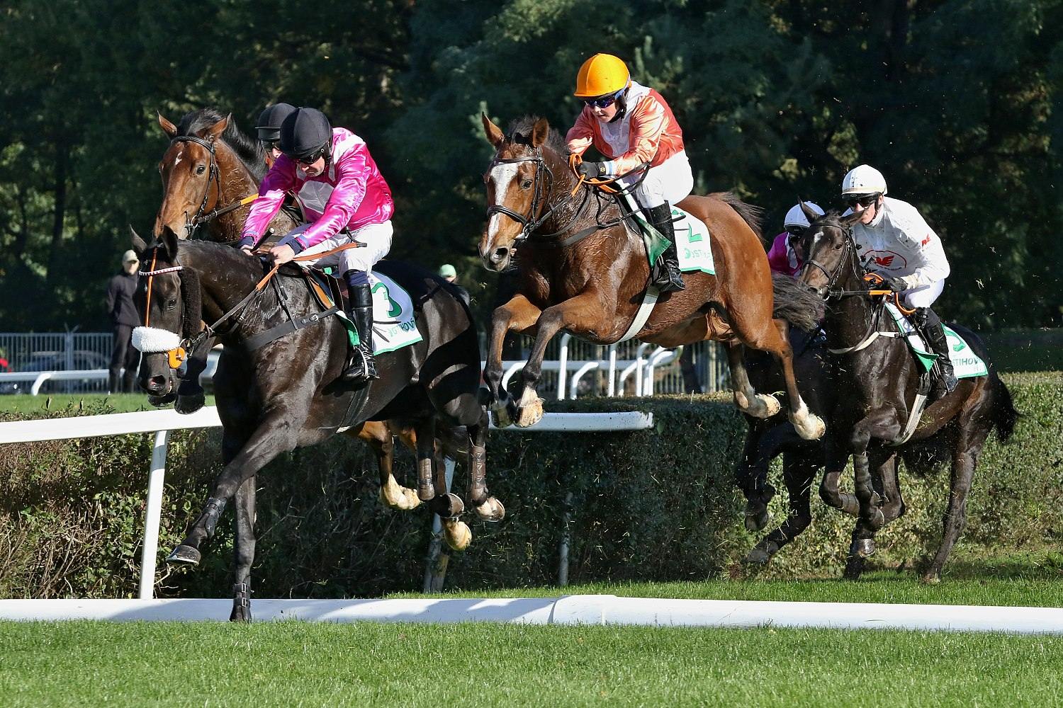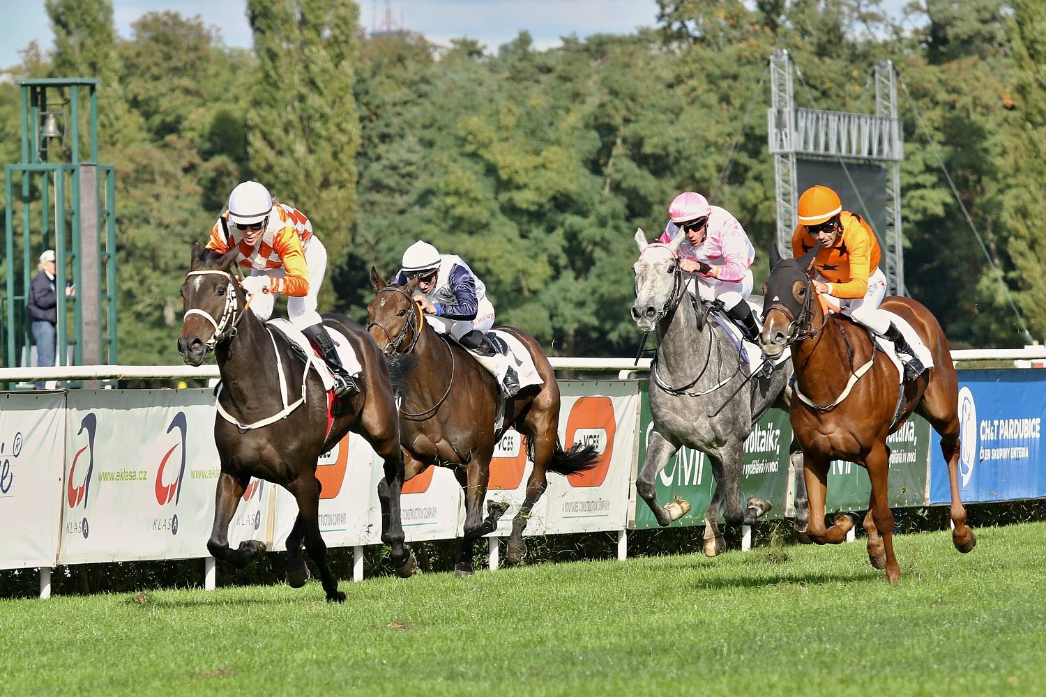 Bohatý předkrm před VP nabídl už sobotní program na pardubickém závodišti. Běhalo se sice “jen” dokola-jedna steeplechase, tři dostihy přes proutěné překážky a čtyři roviny, ovšem většina byla dostihy vysokých kategorií. Ze skoků vyberu Křišťálový pohár města Pardubic (PP, NL, 3400 m.) na jehož startu se sešlo 10 koní. Za svižné tempo vzal hned od začátku třídový RATE (P. Foret), jinak se pole drželo v kompaktní skupině. Od startu ztrácel jen NEL (ž. J. Myška), který byl po jednom kole zadržen a stejný osud potkal hned vzápětí klisnu VIRAGO WESTMINSTER (ž. A. Čmiel), GANIBETa (ž. J. Odložil), GEMILLa (ž. J. Faltejsek) a o skok dál i valacha PALM SPRINGS (ž. J. Bartoš). Do cílové roviny točil první LE GENE BLEU (ž. T. Beaurain) a vedl ještě v její polovině. To už ale mobilizoval síly RATEa jeho jezdec Petr Foret, hnědák stáje Lokotrans chvíli odolával, ale nebylo mu to nic platné. RATE tedy nadělil LE GENE BLEU 1 a ¾ délky, třetí s výrokem daleko doběhla POMELLA (O. Ryzhak), čtvrtý EMOZIONE (ž. O. Velek) a pátý MES AILES (G. Volpe).
