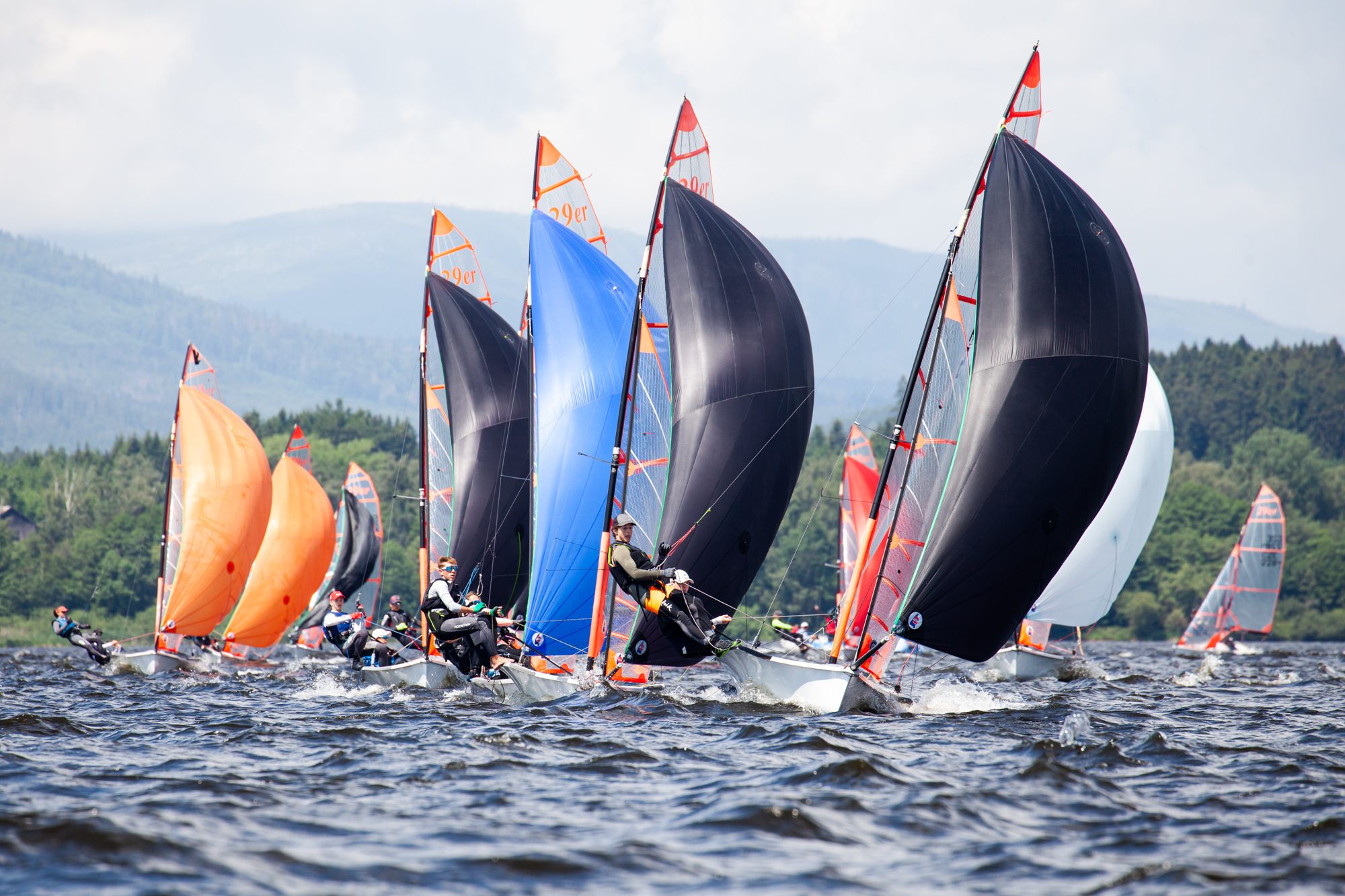 Páteční den byl ve znamení středního až silného větru, když nárazy atakovaly 22 uzlů. Do závodu se připojila také lodní třída 29er a Lipenskou přehradu tak zaplnily barevné genakry olympijských a juniorských skifů, které po ní létaly ve skluzu od Dolní Vltavice až po Černou v Pošumaví.