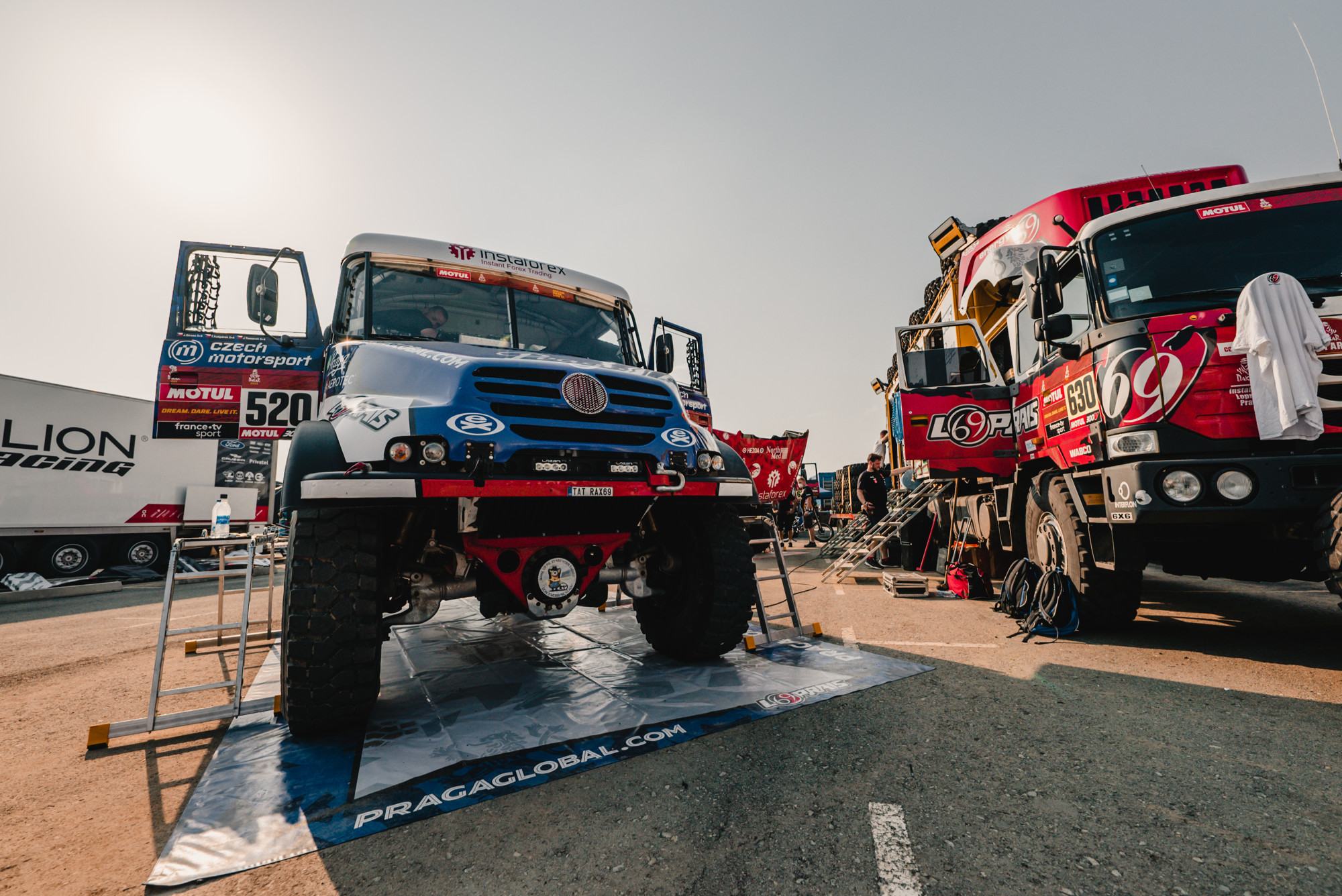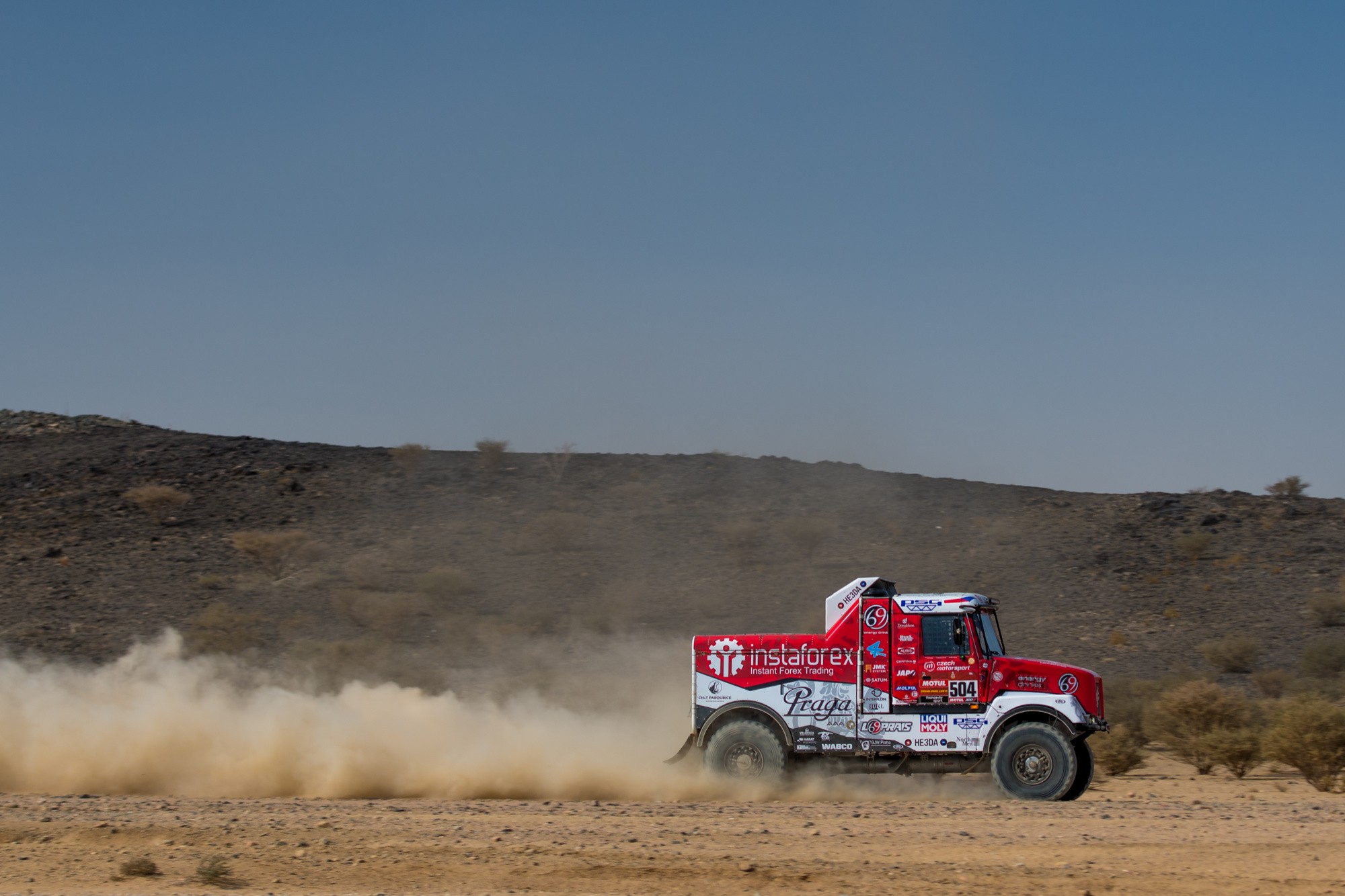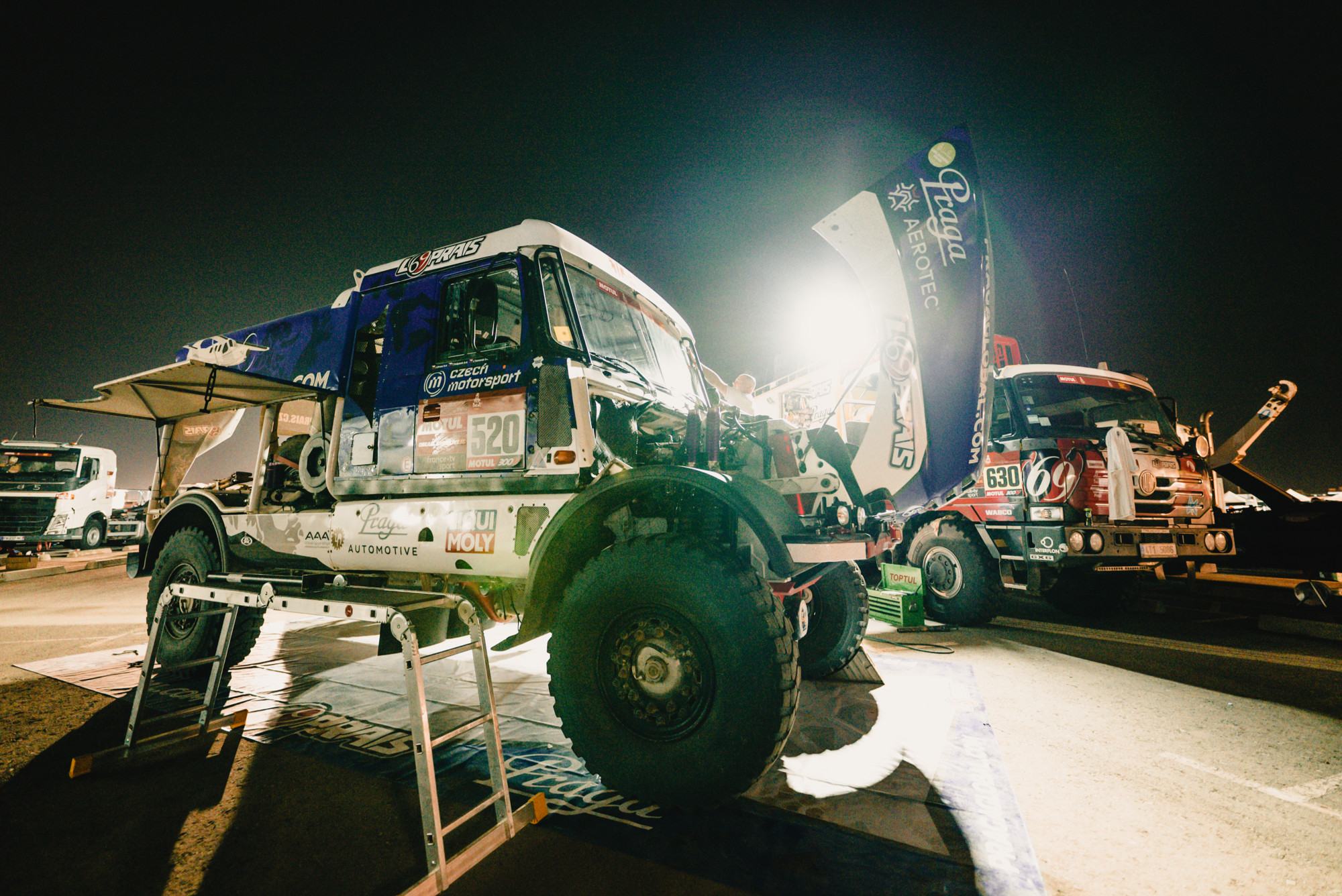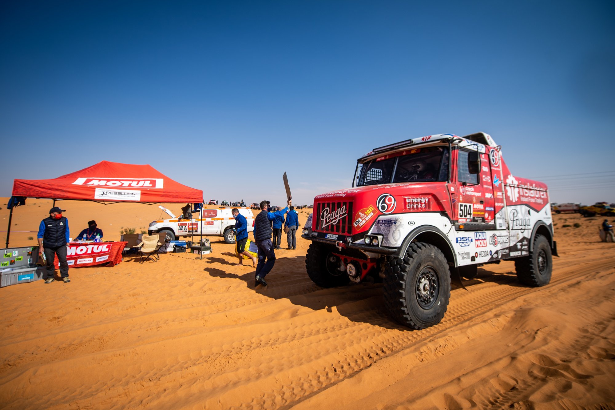 V průběhu dvou maratonských etap sledovali Aleš Loprais, Khalid Alkendi a Petr Pokora výsledky jen po očku. Kromě náročné trati zaměstnávala posádku Pragy V4S DKR také technika, která po osmi dnech nekompromisního dakarského závodění jeví pochopitelné známky únavy. Po dojezdu do Naúmu pohled do výsledků potěšil, ale do cíle je stále velmi daleko. A těžké dny mají ještě přijít.