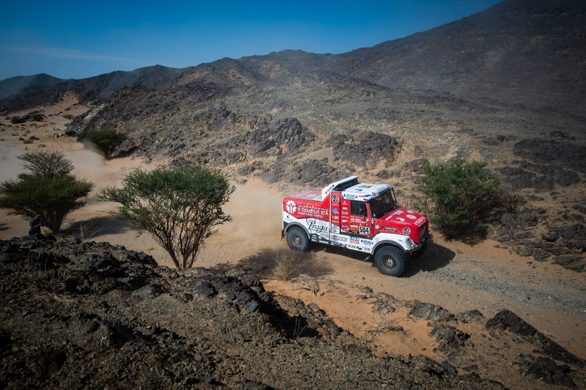 „Byla to velká rozbíječka. Díry, skoky, prach, kamení. Až posledních sto kilometrů bylo hezkých, protože se jelo písečným vádí mezi skalami,“ přibližuje Aleš Loprais.