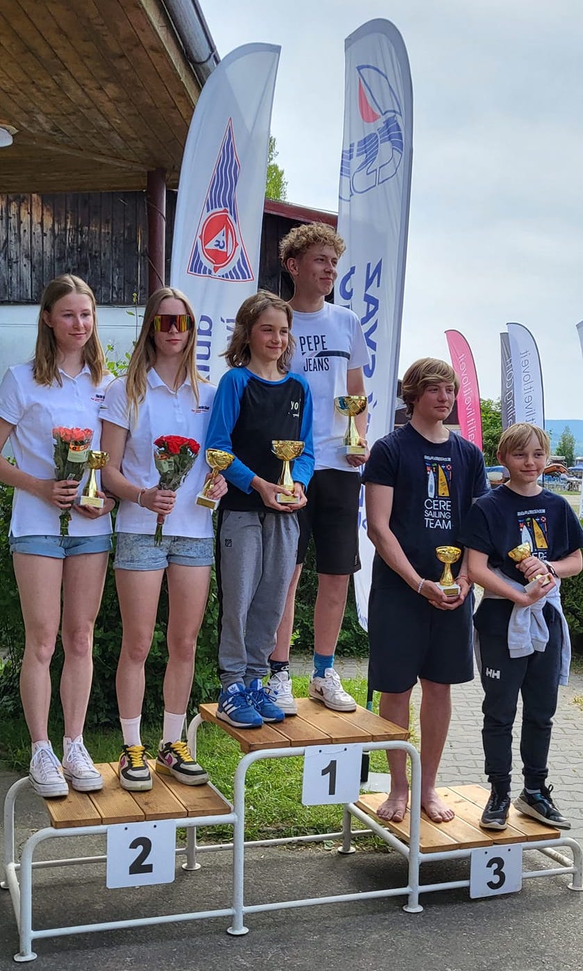 A právě v poslední jmenované třídě byli mezi startujícími posádkami i David Křížek s manželkou Lucií. Závodili spolu vůbec poprvé a hned si odvážejí bronz. „Před závodem jsme trénovali jen asi 10 minut. Převrátili jsme se, roztrhli plachtu a Lucie si i zaplavala. Nestihli jsme start. Ve druhé rozjížďce jsme měli kvůli snaze zabránit kolizi, předčasný start. Nebyl to dobrý vstup do závodu, ale pak už jsme si to jen užívali. Největší dík patří mé nejstatečnější manželce, snad se jí zlomený nehet a modřiny brzo zahojí,“ popisoval David Křížek, pyšný na svého syna, který bral zlato ve třídě RS Feva.