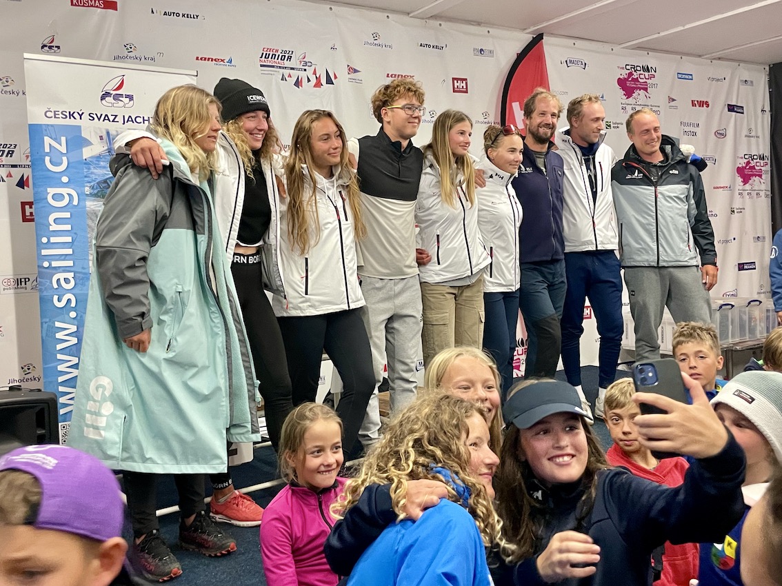 Večer měli mladí závodníci možnost setkat se s českým olympijským reprezentačním týmem. V olympijských třídách iQFoil a ILCA na Lipně závodili i naši reprezentanti, kteří usilují o účast na olympiádě 2024 v Paříži – všichni čtyři členové RODOP iQFoil Teamu – Kristýna Piňosová, Nela Sadílková, Kateřina Chalupníková a David Drda, další windsurfaři Karel Lavický a Kateřina Altmannová, závodníci tříd ILCA bratři Viktor a Ondřej Teplí a Klára Himmelová. Na místě byla také závodnice třídy 49erFX Sára Tkadlecová. Všichni se dětem představili a podepisovali jim kšilty, které k výročí 130 jachtingu věnoval jeden z partnerů ČSJ, firma Helly Hansen. Děti se s nimi mohly i vyfotit. Taková příležitost se nenaskytne každý den, takže to byl pro všechny velký zážitek.