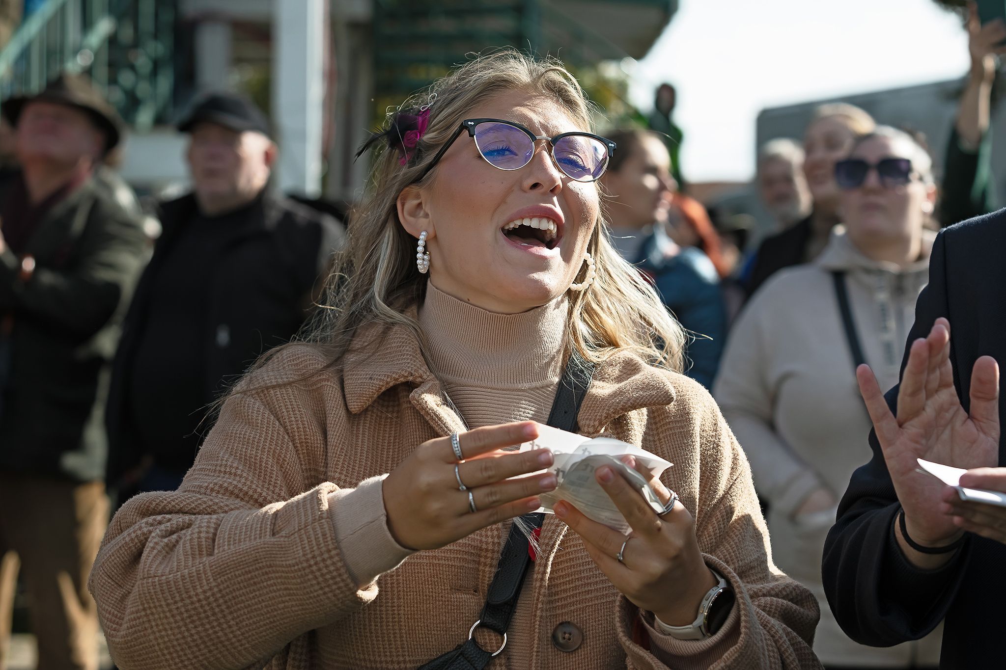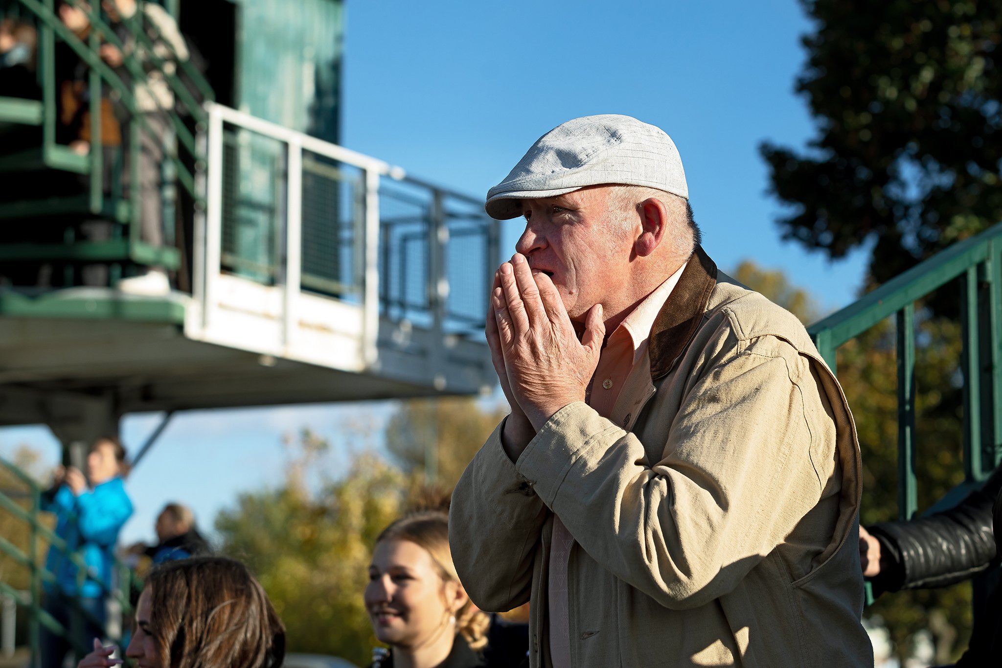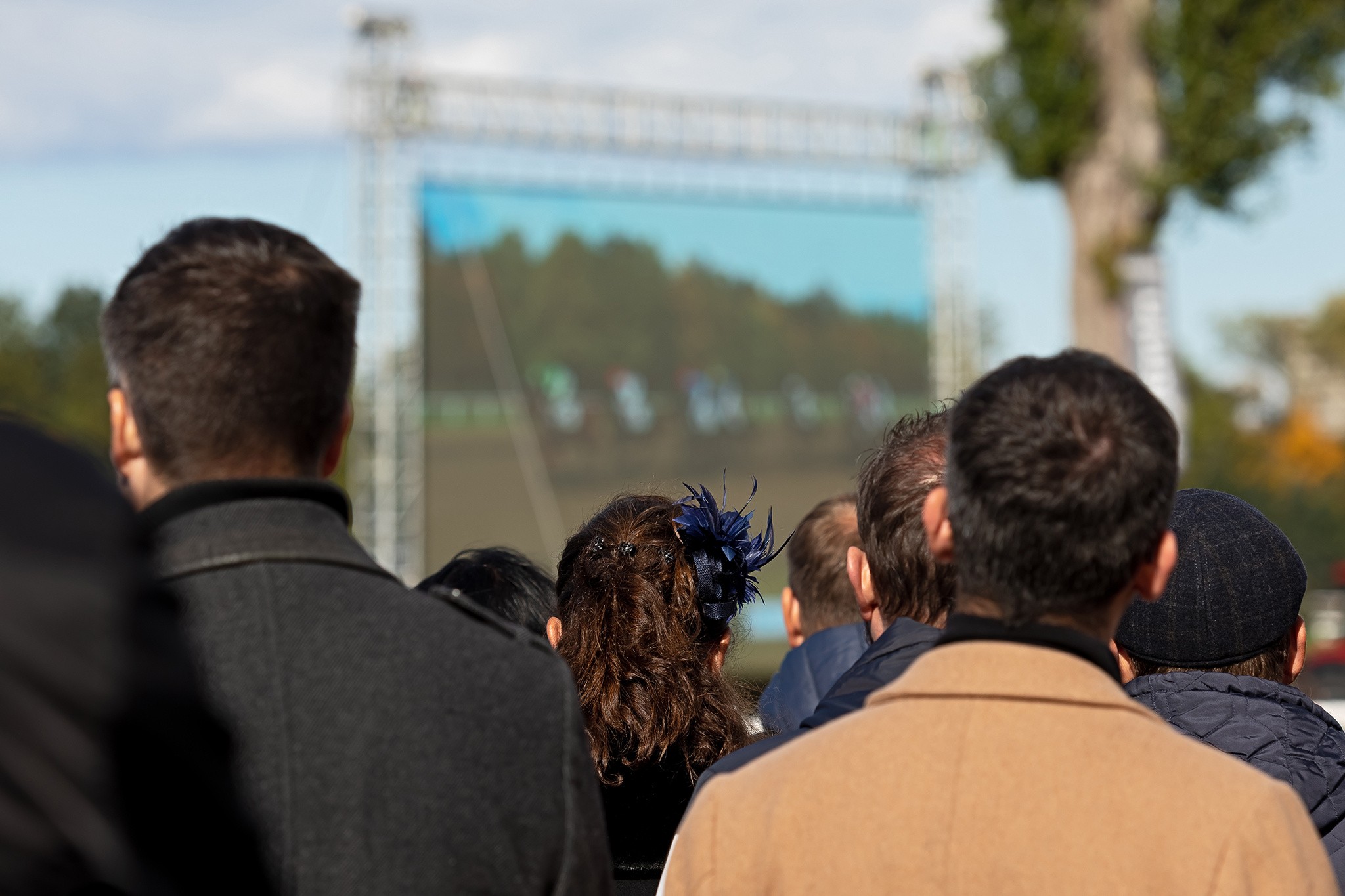 Publikum jako jeden muž vstávající ze sedadel, když koně zatáčejí do cílové rovinky.