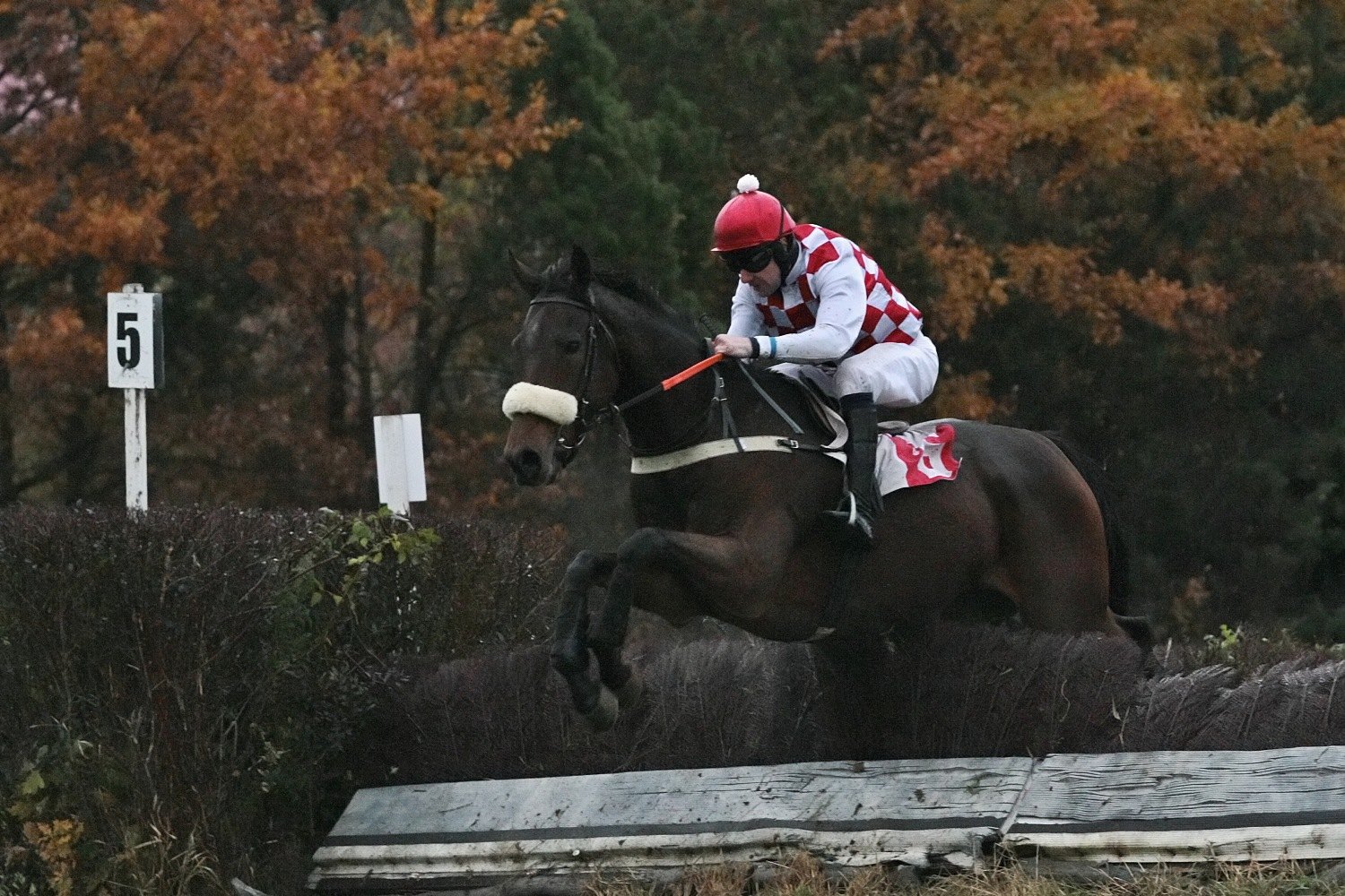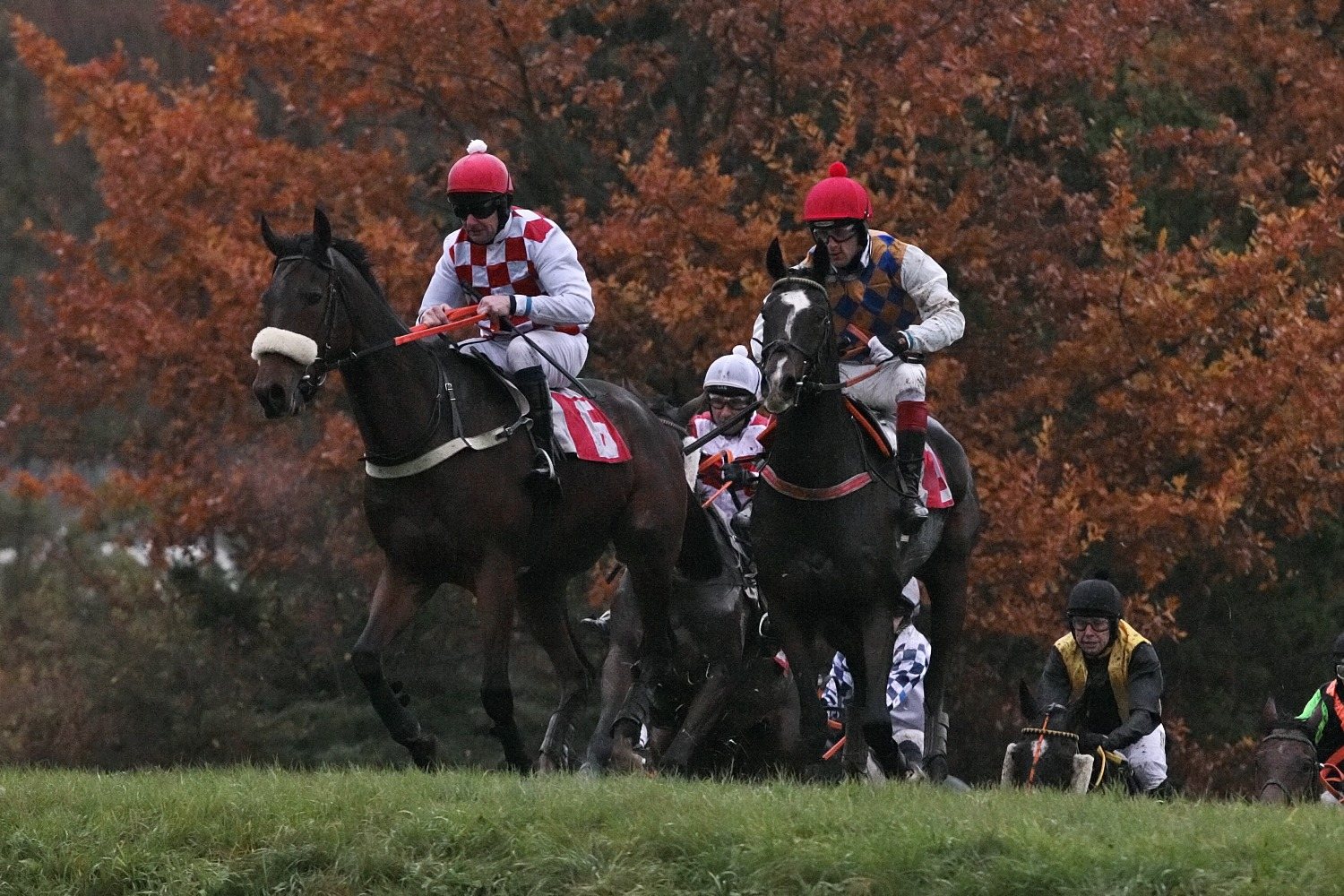 Poslední roky jsme si zvykli užívat na státní svátek 28.10. krásného babího léta na dostizích ve Slušovicích. Že tomu bude stejně se na začátku dne zdálo i letos. Už při druhém dostihu se ale drobně rozpršelo, což ještě přešlo. Poslední tři dostihy se odběhly za vcelku vytrvalého deště a pro fotografy neskutečné tmy.